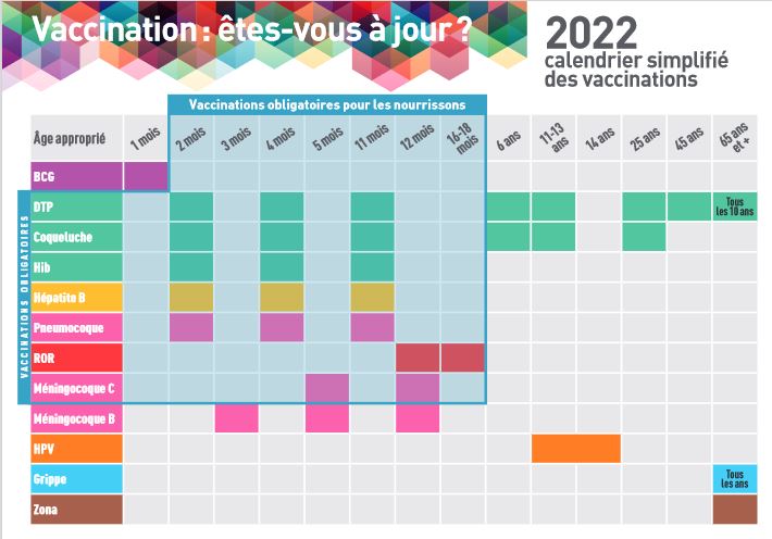 Le calendrier vaccinal permet d’indiquer à quel moment prévoir chacun des 11 vaccins obligatoires ainsi que les injections de rappel, afin :