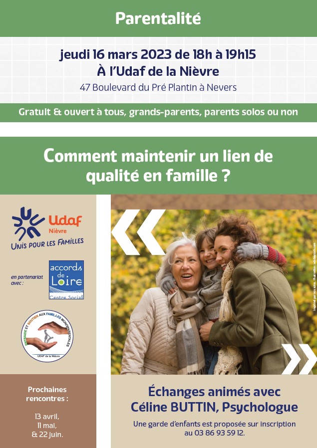 L’UDAF de la Nièvre organise une rencontre autour de la parentalité sur le thème « Comment maintenir un lien de qualité en famille ? ».